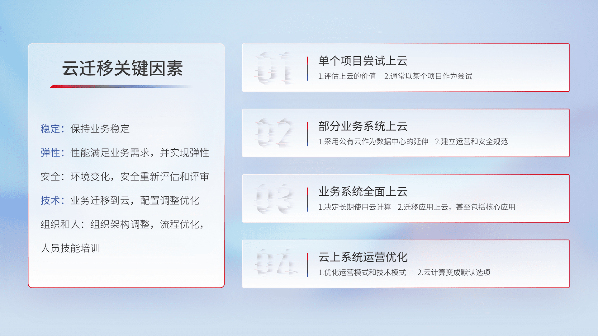 结合实际业务,,,,从规划设计、、、、云平台选型、、、云原生改造、、数据迁移、、集成交付,,,迁移全过程为客户识别最佳上云路径,,做好风险识别管理,,设计网络架构、、身份权限、、、安全审计合规、、、操作审计、、、、日志审计、、、、监控告警策略、、、、多站点容灾设计等,,,对云上基础设施进行整体规划,,提升IT治理水平,,,,以满足弹性、、高可用、、、高性能的需求。。。