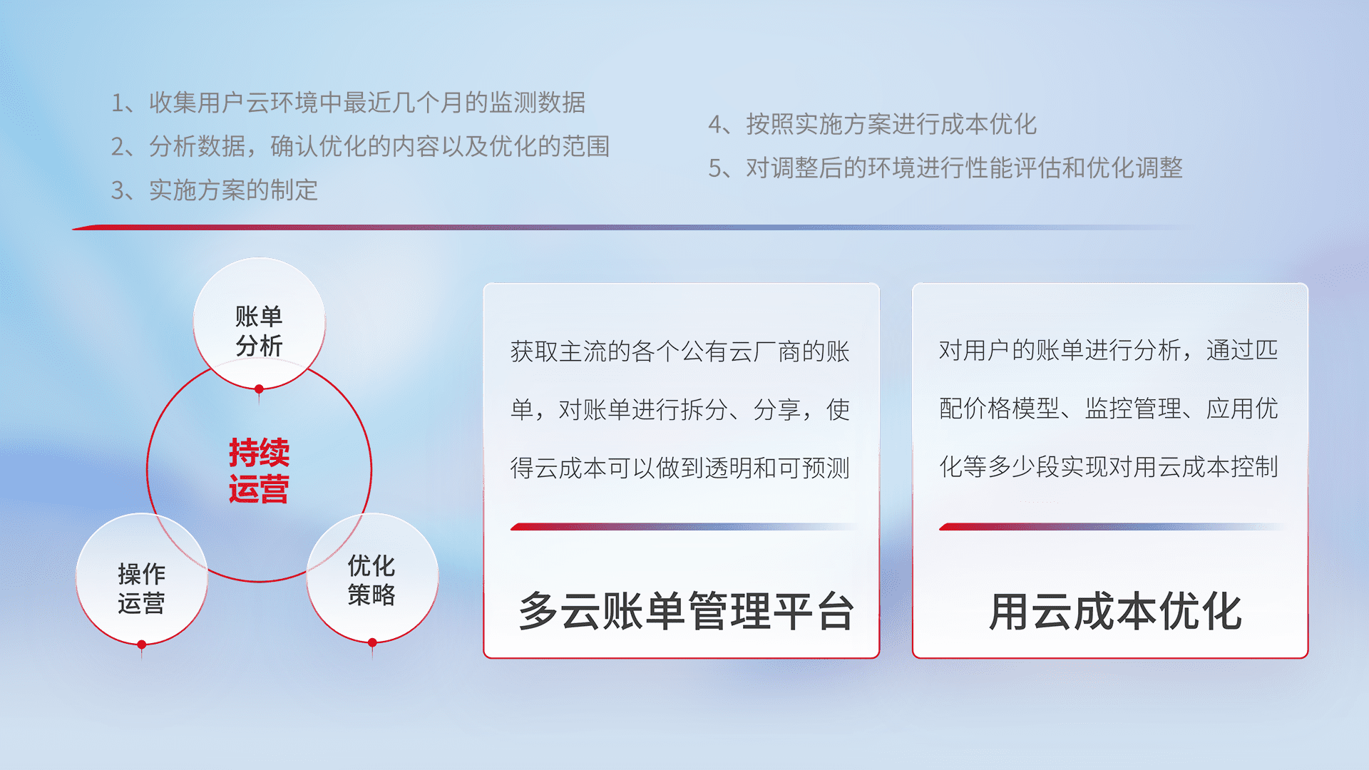 通过多云纳管,,以统一的资源数据模型把客户的云资源进行抽象和封装,,,,进而实现对多云资源的统一操作,,,保障云资源管理的可靠性、、稳定性与可用性。。。量身定制化运维内容,,,,配置、、、开发运维、、、、补丁管理、、、备份、、、监控、、、认证和访问管理、、审计和日常巡检等,,保障在用云过程中的可靠度,,,,稳定度以及高可用率。。