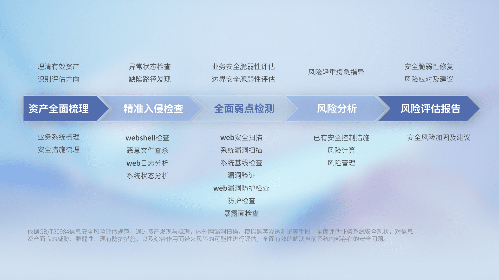 针对客户行业特性,,,,以专业的安全服务+多厂商联合解决方案提供专属的一站式安全管理服务,,,,帮助客户全面感知网络空间威胁,,,,基于识别、、、检测、、、分析、、、、防护、、、、监测、、、响应的服务理论模型,,,从方案咨询、、、、集成交付、、、评估验证、、、优化加固、、、、运维运营,,,,致力于为客户提供完整的闭环管理式安全服务。。以实战经验为客户打造高抵御风险的安全体系,,,,帮助客户发现威胁、、、对抗威胁、、处置威胁,,不断积累安全对抗能力,,,,持续保障数字化安全。。。。