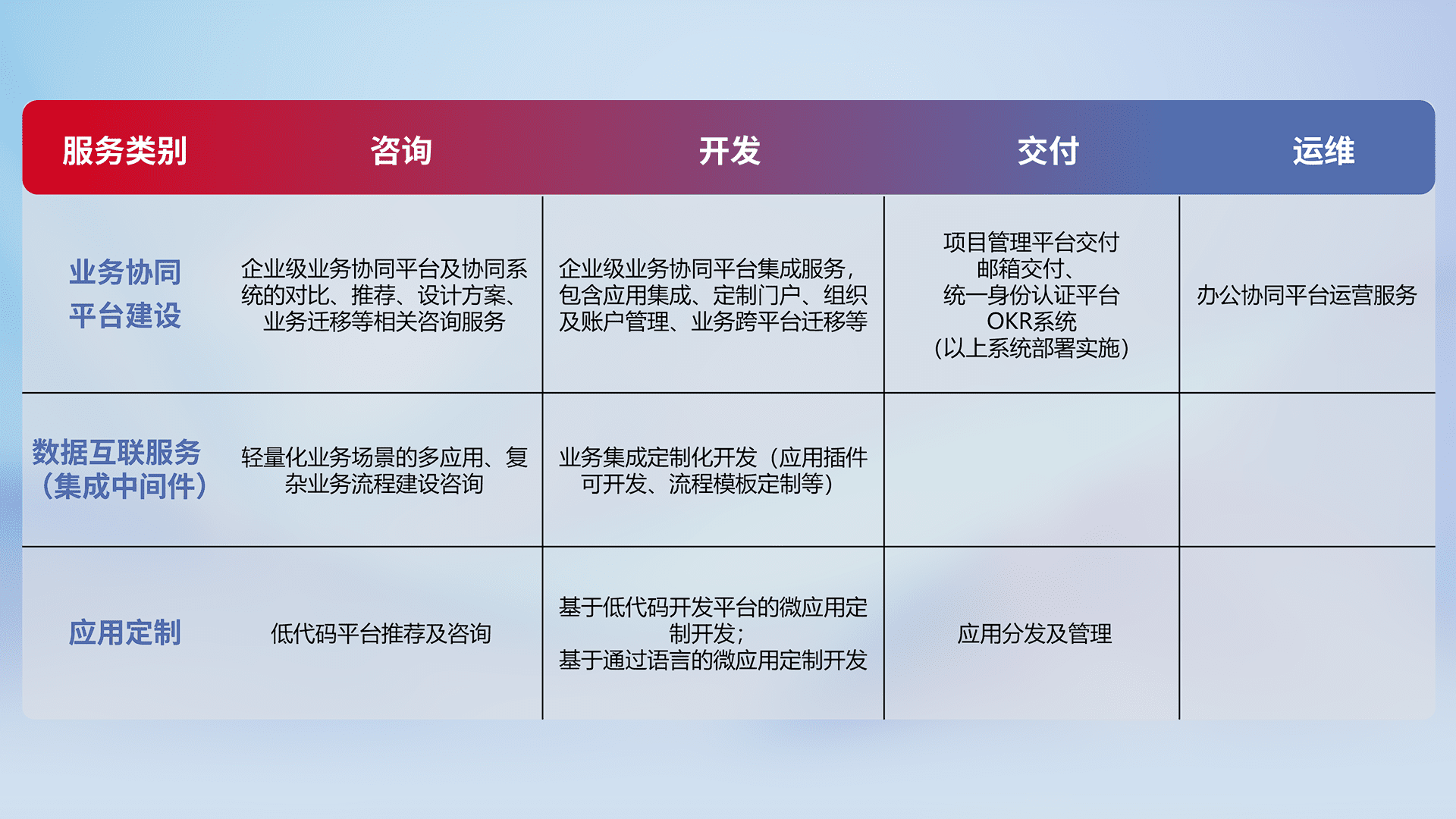 针对钉钉、、、企微、、、、IDaas等平台级产品提供产品的规划、、、、方案、、、、交付、、定制化开发等服务,,,,实现如统一协同办公、、、、智能客户服务、、混合会议管理、、智能数据查询、、等业务场景,,实现数字化转型。。。。